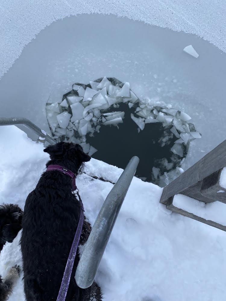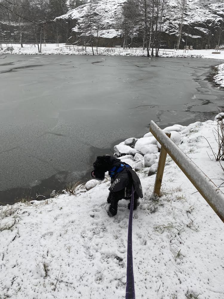 Det är lite småkallt på nätterna så isen är på väg att lägga sig i Vinterviken. Troy den galningen vill gå i, men hallå…..det är ju svinkallt. Han skulle säkert börja plaska runt om inte matte hållit kort koppel.