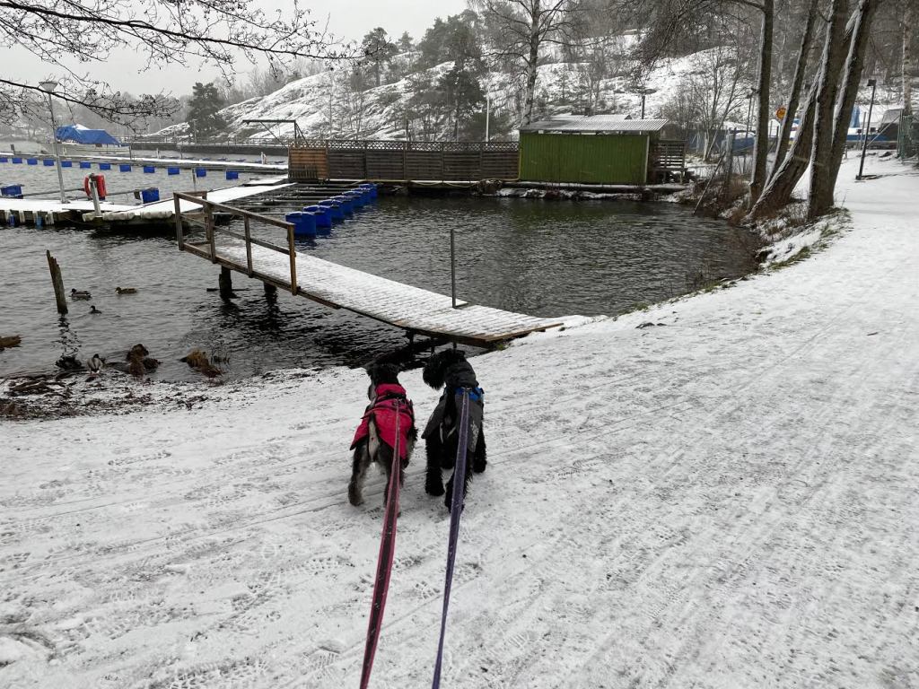 Så började det att snöa, snöslask och det är inte kul. Matte sa att vi går där många går så blir det lättare att gå och inte så mycket snö på benhåren. Vi tog vägen runt båtklubben. Det är bitvis halt och en dam som hade bråttom förbi oss halkade omkull. Det gick bra för vi rusade fram för att fråga hur det gick sen hjälpte vi henne upp. Tack och lov har matte förståndet att ha på sig ICBUGG så hon går säkert.
