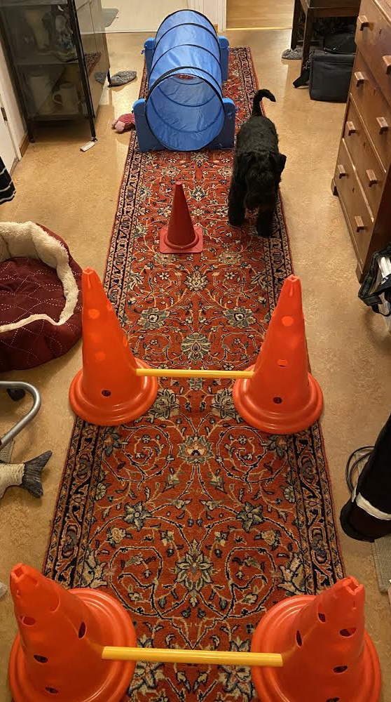 Efter att flera gånger ha hoppat över hindren, sprungit runt konen ett varv för att sen ta mig igenom tunneln är det skönt att vila lite i husses knä. Har sagt till att han måste sitta still. Det är handboll på tv Sverige möter Egypten i semi. Som gammal handbollsmålvakt rycker det lite i benen på honom när Egypten anfaller.