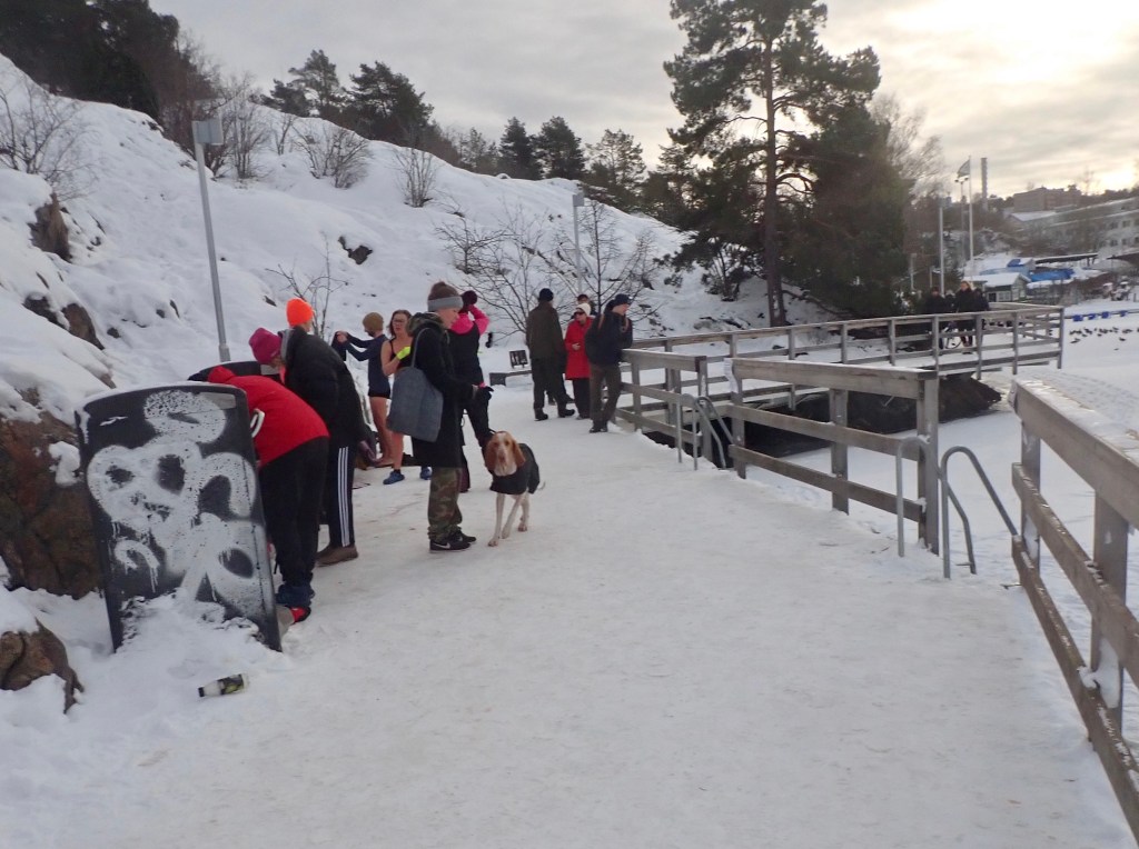 Badgänget hade precis varit i vaken! En dam i röd kappa frågade dem är det inte kallt? Näääe sa en tjej i bikini det är inte kallt. Maja sa matte jag har lite svårt och tro det! Jag också sa damen i röda kappan, jag med voffade jag!