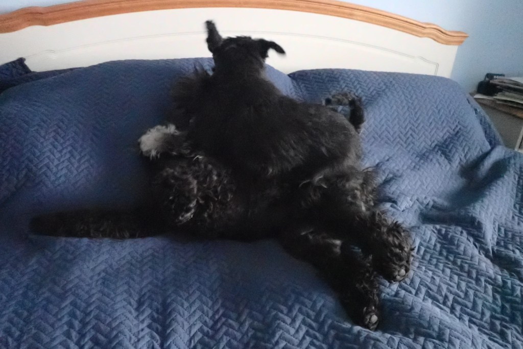 Hemma kan man brottas på sängen. Matte säger att Troy är för snäll som lägger sig frivilligt på rygg! Bah säger jag.