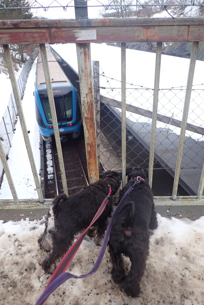 Kontroll av vilka som stigit av tåget. Det går en vovve där som vi inte känner.