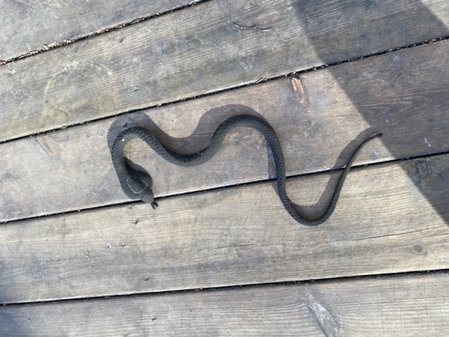 Flera personer som passerar grannens plats stannar och tittar. Vissa går försiktigt in och petat lite på något som ser ut som en orm. Matte är inte rädd för ormar bara för stora spindlar då vaknar hennes mördarinstinkt direkt. Hon var över och kollade men det var bara en låtsasorm. Grannen brukar ha den på taket som fågelskrämma!