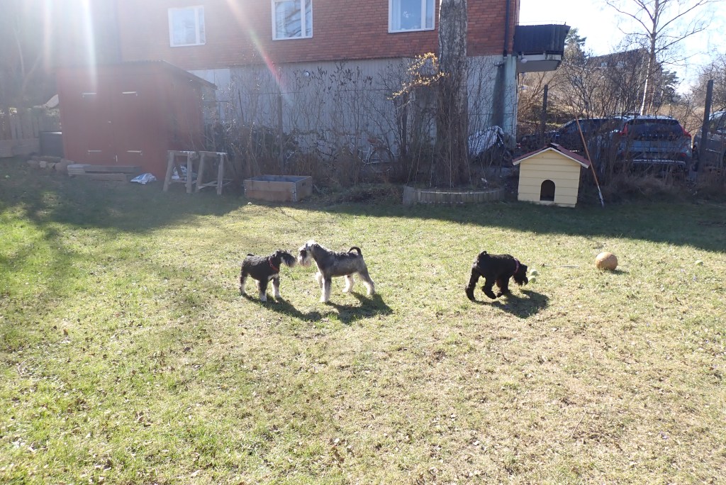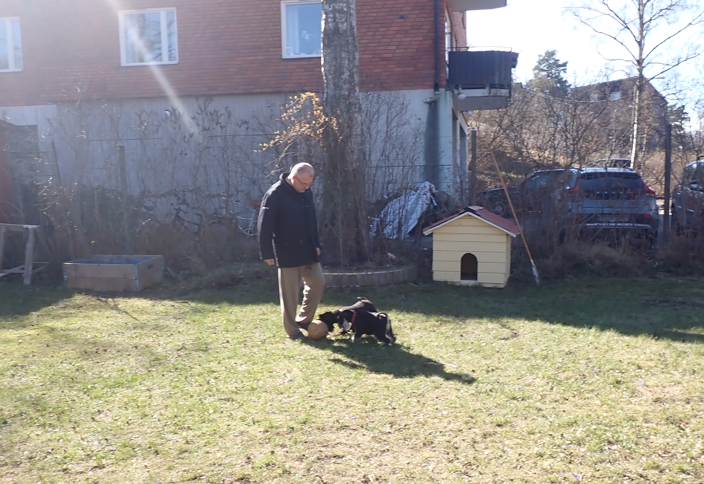 Vi gick längs en av våra promenadvägar. Från en tomt hörde jag någon som ropade, det var Kalle! Hans husse kom fram till staketet och bjöd in oss. Kalle är en rik kille med många skatter på sin tomt, massor av tennisbollar som han hittat och tagit hem. En stooor härlig fotboll sådär lagom pumpad så man kan ta tag i den även om man inte har så stort gap. Där fanns också en hel hög med fina pinnar.