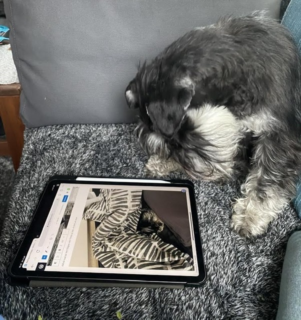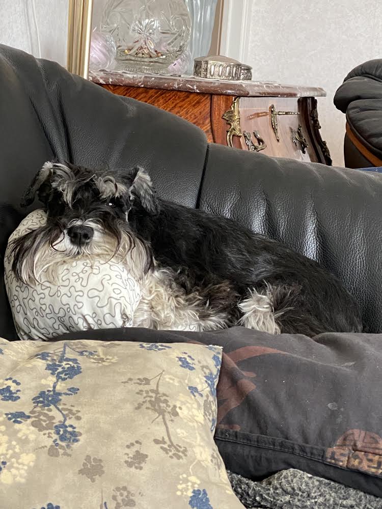 Efter promenad är det skönt att vila i soffan. Jag samlar alla kudddarna i en hög för man kan inte få för många sådana. Ligger och tittar lite på matte.