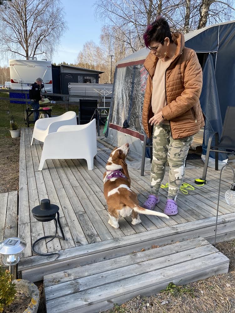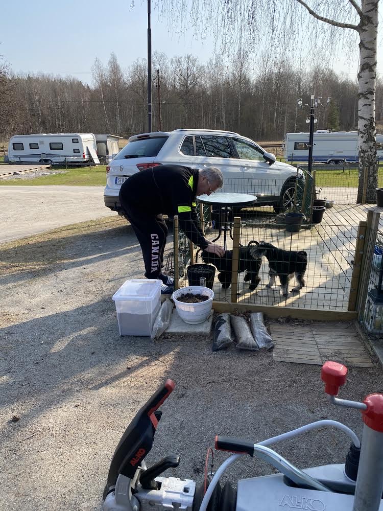 Det är mycket att vårfixa i förtältet, på trallen och tomt. Det börjar komma grannar som också håller på med vårfix med sina vagnar och tomter. Det är väldigt bra grannar för de kommer till vår plats och hälsar på oss. Vi gillar alla grannar men vissa lite mer. Micke som bor tvärs över ”gatan” gillar vi verkligen.