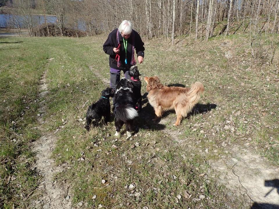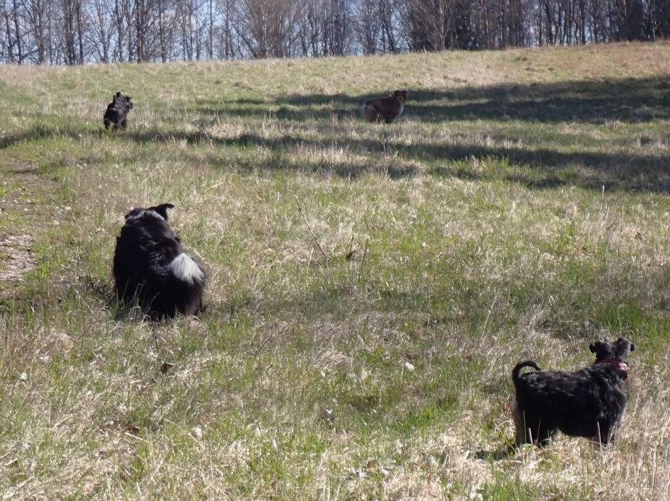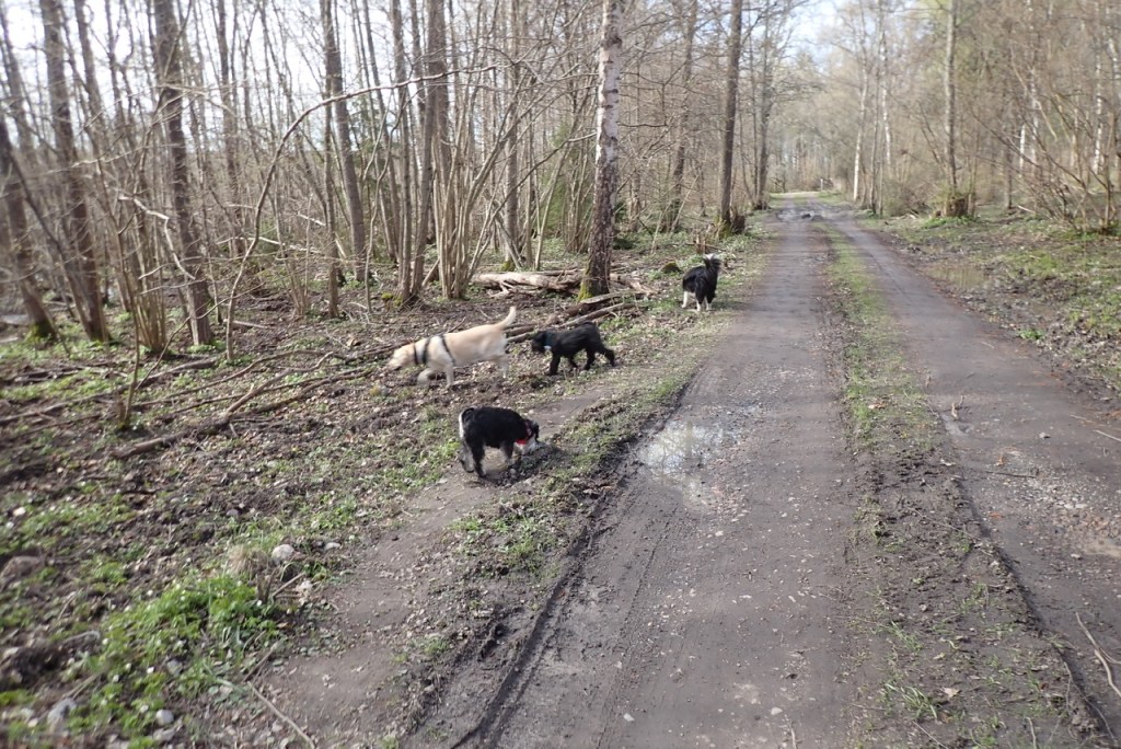 Vi tog bilen och åkte iväg för att träffa Helena med gänget Wilma, Basse och Alice vid macken för vidare färd. Vi åkte jättelänge och äntligen kom vi fram. Vi fick springa på fria tassar längs med en skogsväg. Basse stack i väg in i skogen för att kolla något han fått nos på, vi andra hade mycket att kolla av längs grusvägen.
