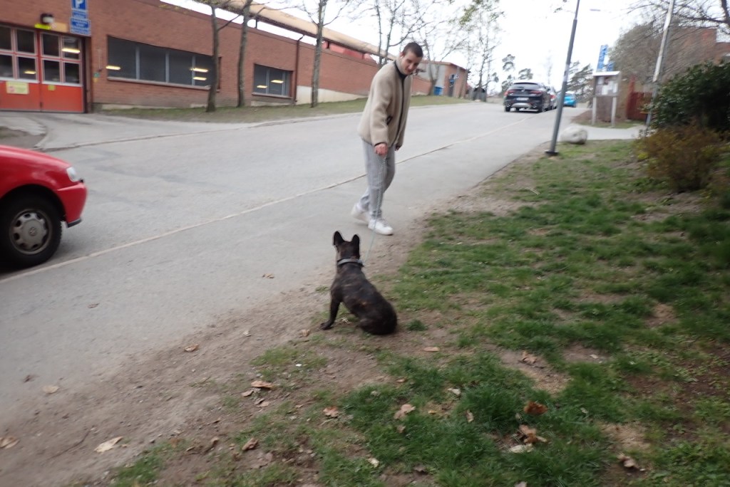 När vi kom hem till stan stannade vi på gatan vi källaringången för att lasta ur bilen. Då kom Messi som var ute med sin lillhusse. Messi vägrade gå för enligt lillhusse väntade han på sin matte. Han satte sig och trots att lillhusse försökte med lock och pock satt han ståndaktigt kvar.