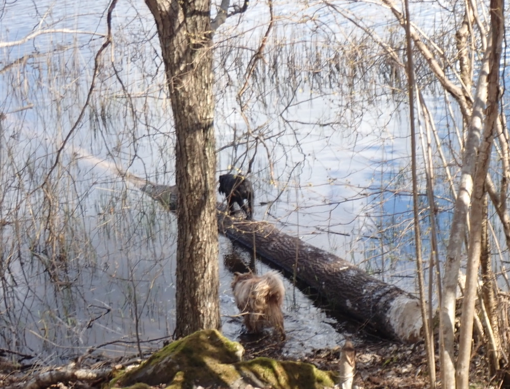 På väg tillbaka till campingen visade Basse Troy att det finns ett härligt träsk att bada i! Troy var inte sen att hoppa i, han är en tantbadare dvs han går bara i till magen. Nu på våren det är gott om vatten i träsket Vi andra släckte törsten utan att bli blöta.