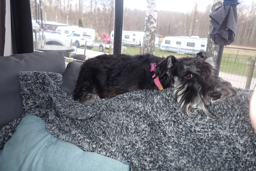 Det var bara 1 + grad ute när det blev dags för en nattpinkatur. Därför blev den blev inte så lång för jag ville tillbaka till vagnen och den goa värmen. Så fort jag kom in hoppa jag upp i mattes säng och gosade ned mig på min sovkudde. Det är så mysigt för när vi båda ligger där kan jag lägga upp min haka på mattes axel å vet ni…. då låter hon lite som en katt. Detta är mitt och Troys paradis, ja jo, även M&H trivs här. Nu måste jag sova minst sju kvart i timmen för i morgon stundar äventyr men det berättar jag om senare. Zzzzzzzz!