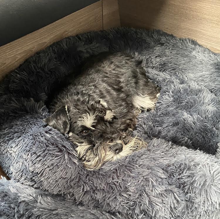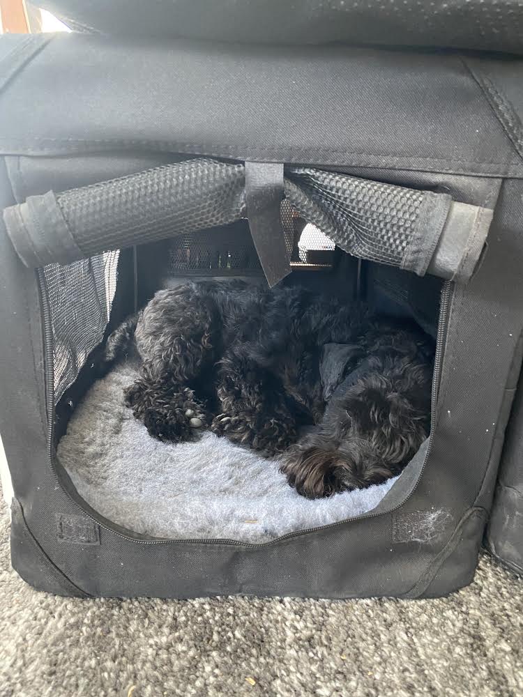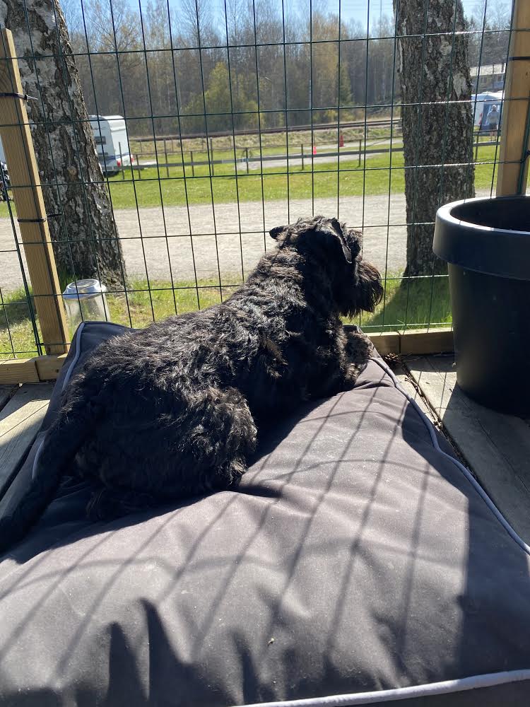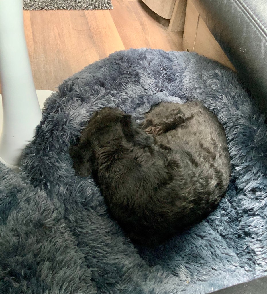 Väl hemma i vagnen åkte vi på en tass- och skäggdusch i hundduschen för att försöka få bort lera och tillsammans med kardan få bort de nedrans kardborrarna. Efter duschen käkade vi lite kycklingkex sen tog vi en vilostund i våra mysiga gosiga korgar. Zzzzzzz