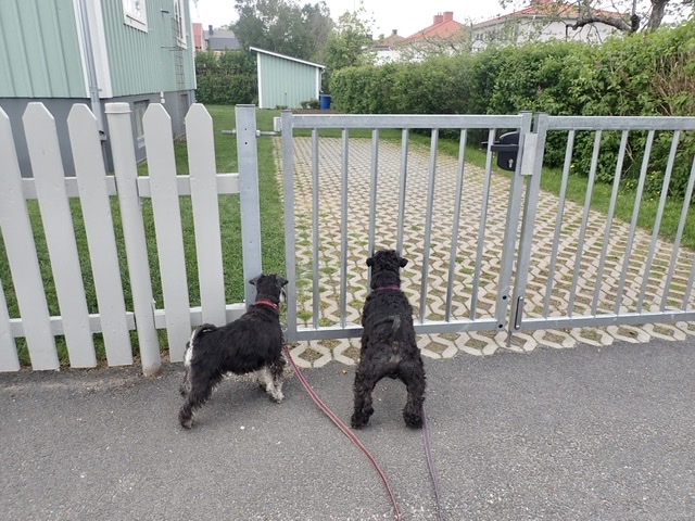 Troy stelnar plötsligt till och stolpar med stela framben fram till en grind. Dovt morrande stirrar han in i trädgården. Jag går fram och avger i stödjande syfte mitt allra farligaste varningsmorr när jag ser vad han morrar åt. Knäppskallar säger matte, det är en robotgräsklippare! Näää säger vi, det är något jättefarligt som vi med gemensamma krafter skulle behöva döda.