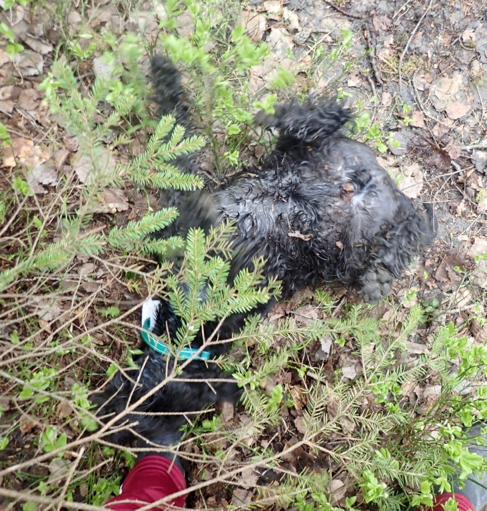 Summering. Alltså först drattar han i sjön, sen grävs det i dy och upptagning av sjöväxter därefter så avslutas det hela med helkroppsrullning i något okänt. Ja, han är en liten gris! Jag vill bara tillägga att jag, jag är helt torr, jag är inte ens våt om tassarna!