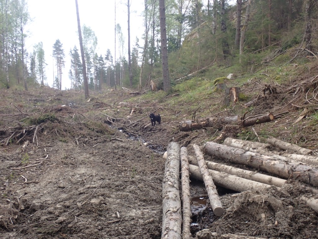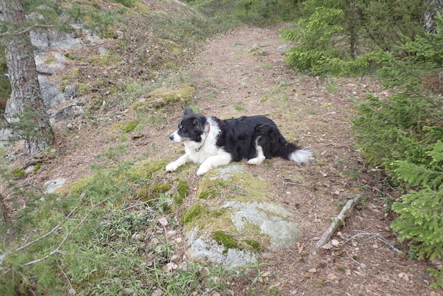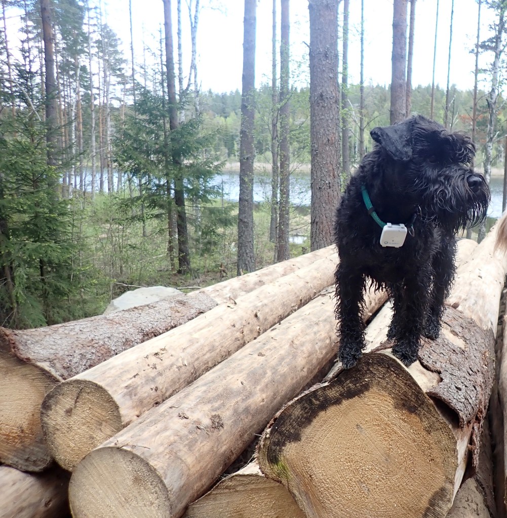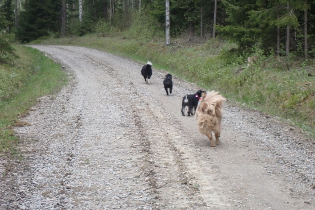 Tillbaka till vagnen. När det blir en morgon med väckarklocka och vi får på oss halsband med skvallerdosa är det kul saker på G. Vi kör efter Helenas bil och efter en evighet, då vi pipigt under stor del av bilturen, är vi framme vid ett nytt ställe. När vi kommit ur bilarna blir det en stund för hälsning. Först får vi gå en kortare koppelpromenad in i skogen innan det blir fria tassar. Wilma som hittar här leder oss andra som inte varit här förut till spännande ställen. Hon lunkar på i sin takt så det gäller att hänga på!