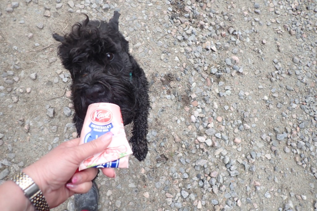 Troy den markbundna hundraketen kutar nu ut på berghällen som sluttar ganska brant ner mot vattnet. Matte utbrister näee stopp ditt lilla fjuss nu kommer du ju åka i. Det går som det bara kan gå, han drattar i sjön med ett jätteplums och försvinner ner under vattenytan. Jag springer fram för att se om jag kan hjälpa honom när matte säger nej, stanna… det räcker med att en plurrar och det har hon ju rätt i. Han kommer frustande upp till ytan och först blev han lite stressad för det gick ju inte att komma upp på den branta och nu också våta berghällen. Matte kan inte nå honom utan att gå i själv vilket hon inte tänker göra om det går att undvika. Hon pratade lugnade med honom och visade med handtecken att han skulle simma lite åt sidan där det fanns en liten strandkant där han kan komma upp ur vattnet. Han fattade och simmade lugnt dit hon pekade, ibland lyder han faktiskt och han simmar väldigt bra.