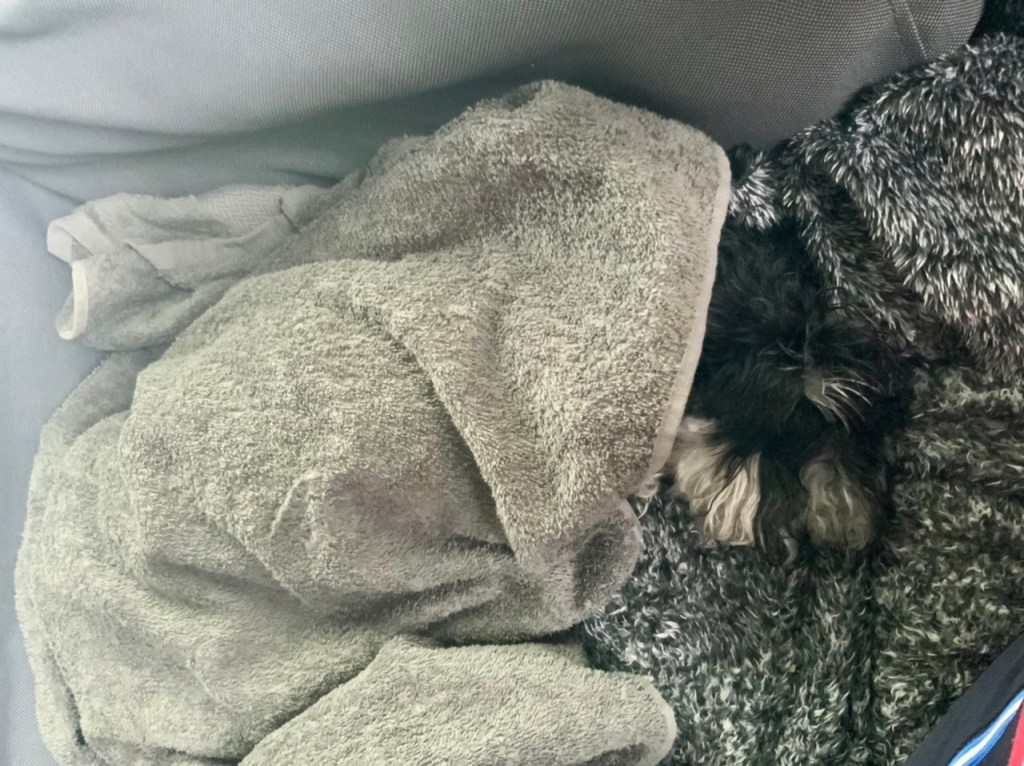 På vägen tillbaka till vagnen överraskades vi av ett regn. Fy bubblan alltså jag som inte tycker om att bli våt. Vi skyndar på men blir ändå rejält blöta. Matte den snälla torkar av hela mig, ja hon riktigt gnuggar mig och Troy torra. När jag lagt mig på soffa och fryser lite sveper hon in mig i en torr handduk och efter en stund blir jag riktigt varm. Nu tänker jag inte gå här ifrån på länge iallafall inte så länge som det regnar.