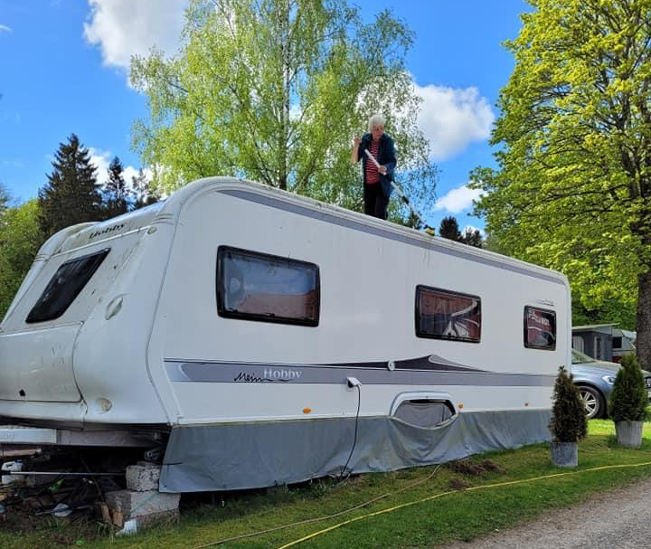 Alltså matte min matte vad gör du? Uppe på taket på grannens vagn! Jag och Troy intar bevakningspossition på vår trall beredda att ingripa om något händer. Det gjorde det inte och vi är jätteglada när hon kommer ned!