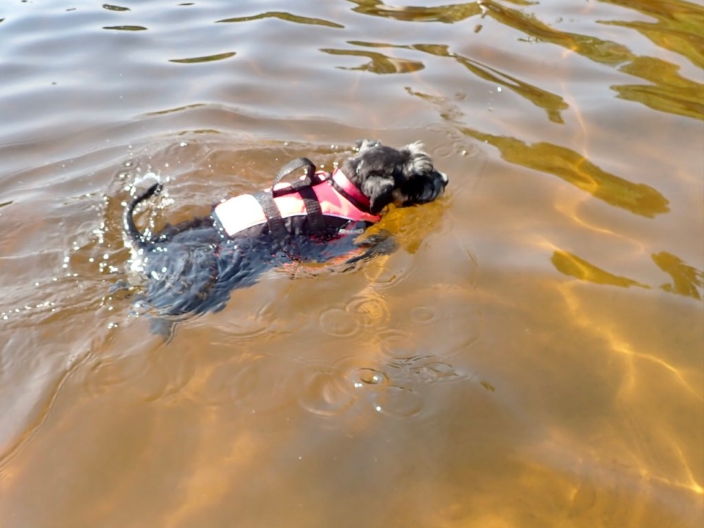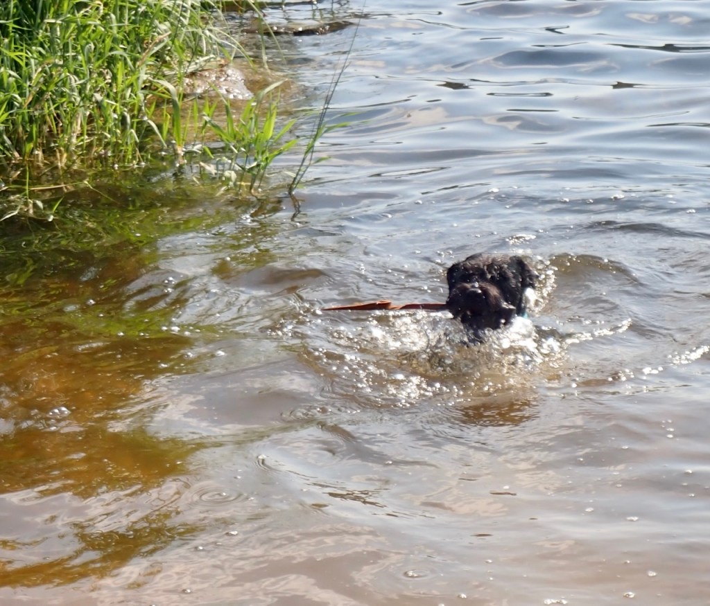 Troy simmar glatt iväg och hämtar pinnen vänder och kommer tillbaka. Han simmar så det skummar svallvågor. Han ger matte pinnen för att hon skall slänga i den igen. Undrar hur länge han kan hålla på?