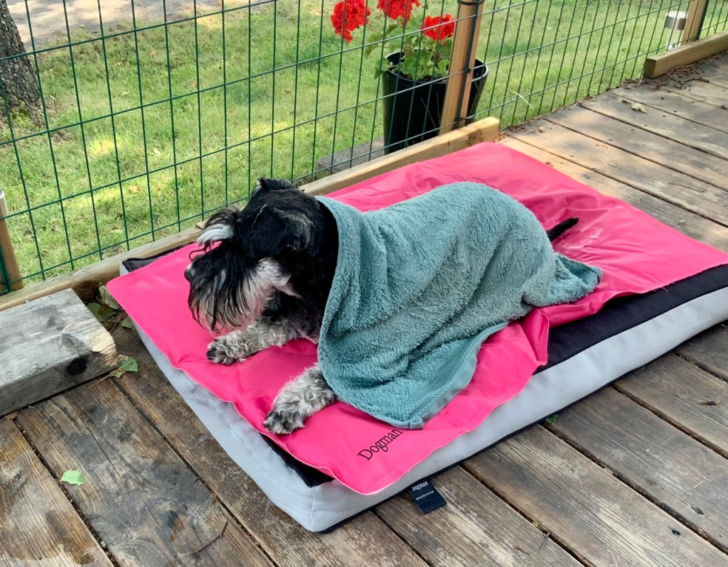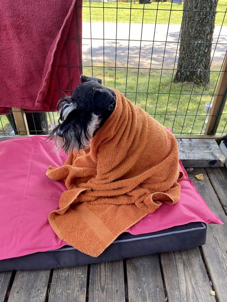 MOHA! säger matte, hur kan du frysa så du skakar när det är 29 g varmt? Jaha.. vad tror du? Har men varit i en kall sjö och simmat blir det så! Kall sjö säger matte det är ju för tusan hakar mer än 24 grader varmt i vattnet!