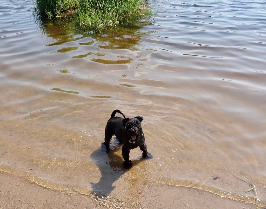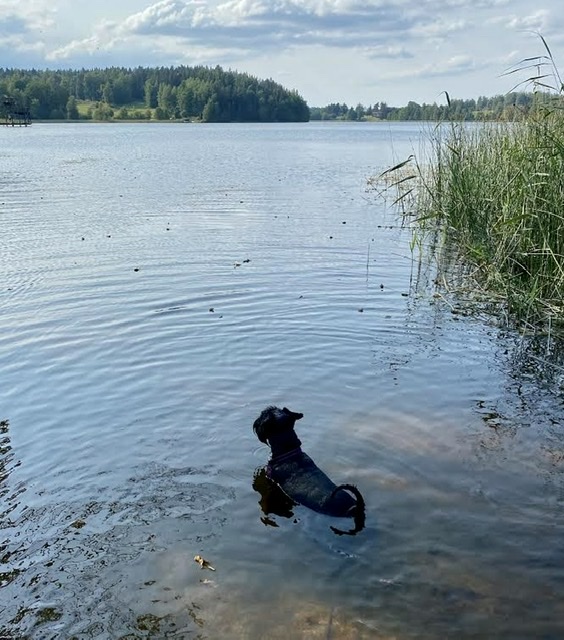 Nu är det sååå varmt till och med matte var i och badade. Hon och Troy var onödigt långt ut tycker jag som höll mig i strandkanten och bara gick i med tassarna. Tvärs över sjön åt det håll Troy tittar finns Tommys badstrand. Undrar jag om han tänker simma iväg dit för att se om Basse är där och badar.