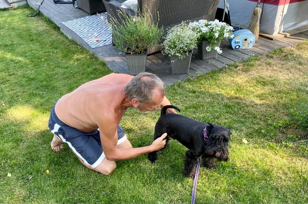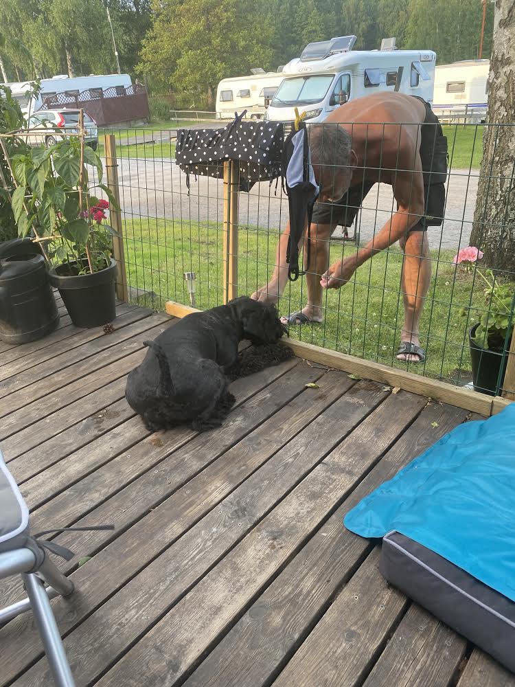 På campingen finns många goda grannar! Nisse i vagnen tvärs över vägen är en väldigt god vän till oss. Han vet exakt var Troy gillar att bli kliad. Jag pussas mest.