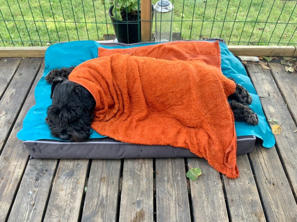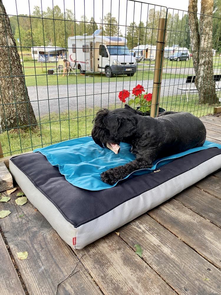 Nu är det för varmt så vi måste få hjälp att svalka oss, vi njuter av att få kalla våta handdukar över oss när vi ligger på kyldynorna.