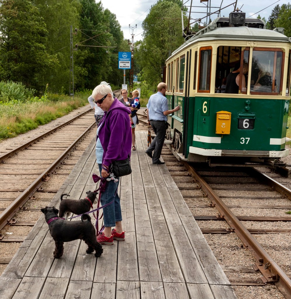 Ny dag nya äventyr. Det var lagom värme idag så vi tog en tur med spårvagnen. När vi kom ned till hållplatsen var det många där. Vi väntade tills de stigit på vagnen mot Malmköping. Vi tog vagnen åt andra hållet för på den fanns det gott om plats.