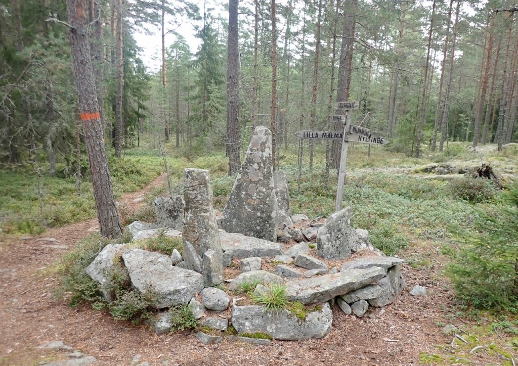 Titta nu är vi framme, vi är vid staven. Alltså det är ett gammalt gränsröse som markerar 4 st sockengränser.