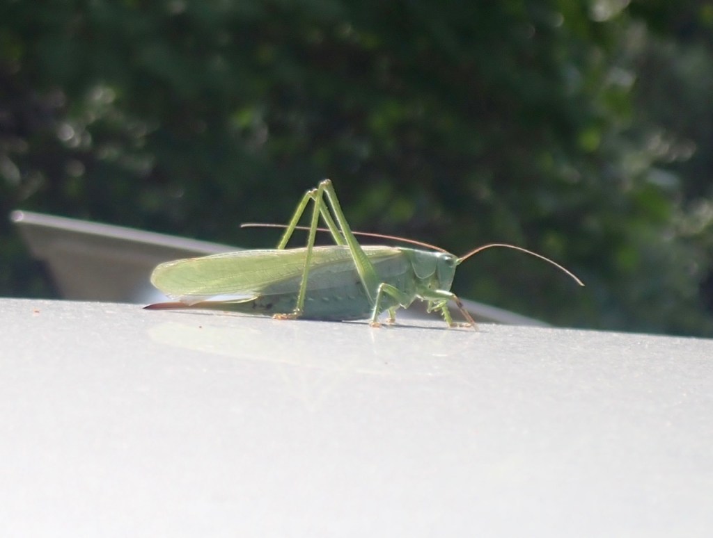 Sen började de intressera sig för något på biltaket. En jättestor vårtbitare som varsamt men bestämt förpassades in bland några buskar. Den mellanlandade på Helenas gula T- tröja.