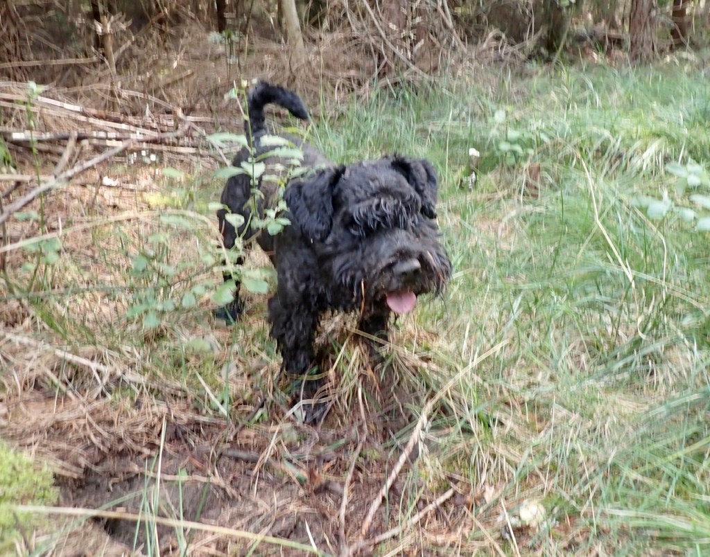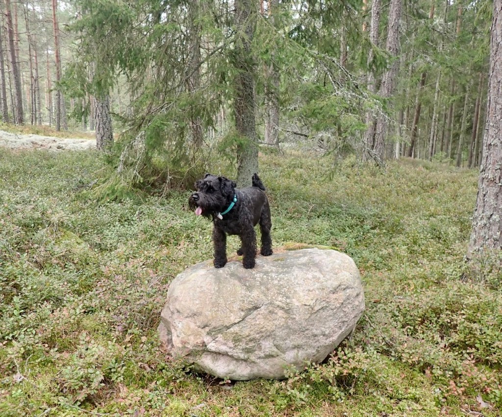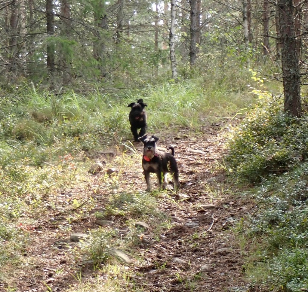 Troy sitter och filosoferar! Jag tror han saknar Basse för de två brukar sysselsätta sig med flockspring i skogen. Wilma och jag är inte så sugna på att fara fram i hösta fart bland träd och mossa, vi damer går lite mer värdigt och kollar runt lite vad som finns vid sidan om stigen.
