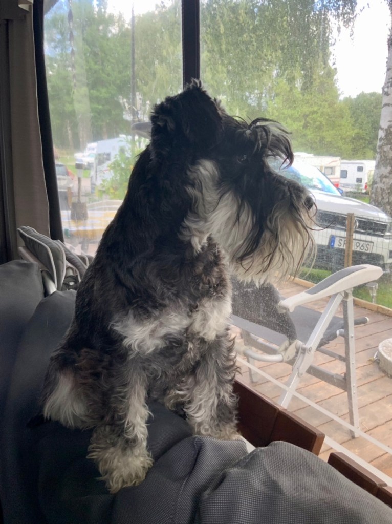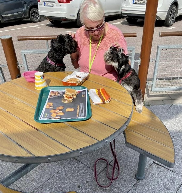På väg till vagnen drabbas vi alla av en plötslig hunger. Vi stannar till på Mc Donalds och matte beställer en QP naturell dvs en hamburgare utan äcklig senap och ketchup inte heller någon dressing lök eller bröd. Vi får sitta med vid bordet men det är hårda regler som gäller, ingen självservering, inga nosar eller tassar på bordet! Det kommer folk förbi och tycker vi är duktiga! Vår QP försvinner rätt fort och efter en slurk vatten är vi redo för resten av bilresan.