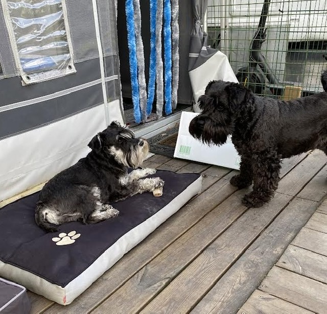 Äntligen är vi tillbaka till vagnen. Jag har ett allvarligt samtal med Troy om rangordning och revben. Jag lägger min tass på benet så han förstår att han får ta ett annat ben!