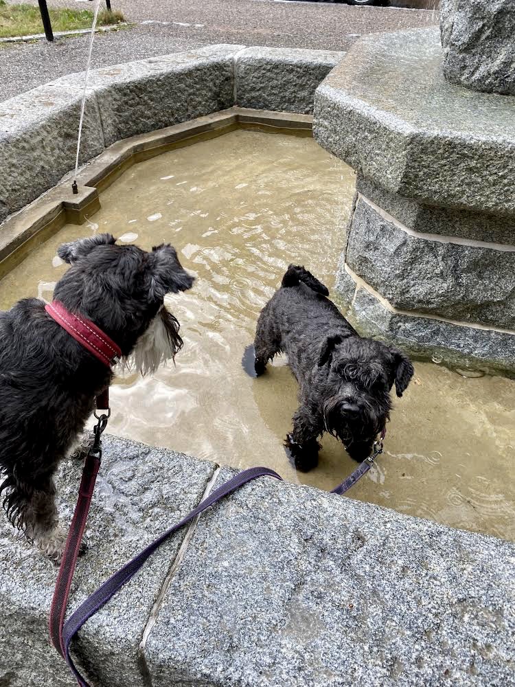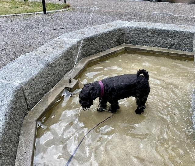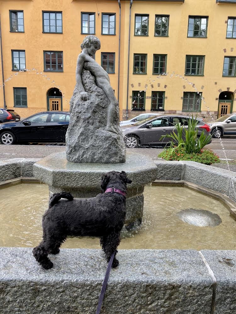 Troy var jätteglad, man har satt på vattnet i fontänen vid Manheimsgatan. Det måste självklart inspekteras!