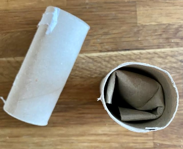 Sen är det dags för toarullen. Matte stoppar in godis i en rulle, viker in hörnorna och sen stoppas paketet in i ytterligare en rulle. Nu får man jobba för gotterna. Jobba sa Troy.
