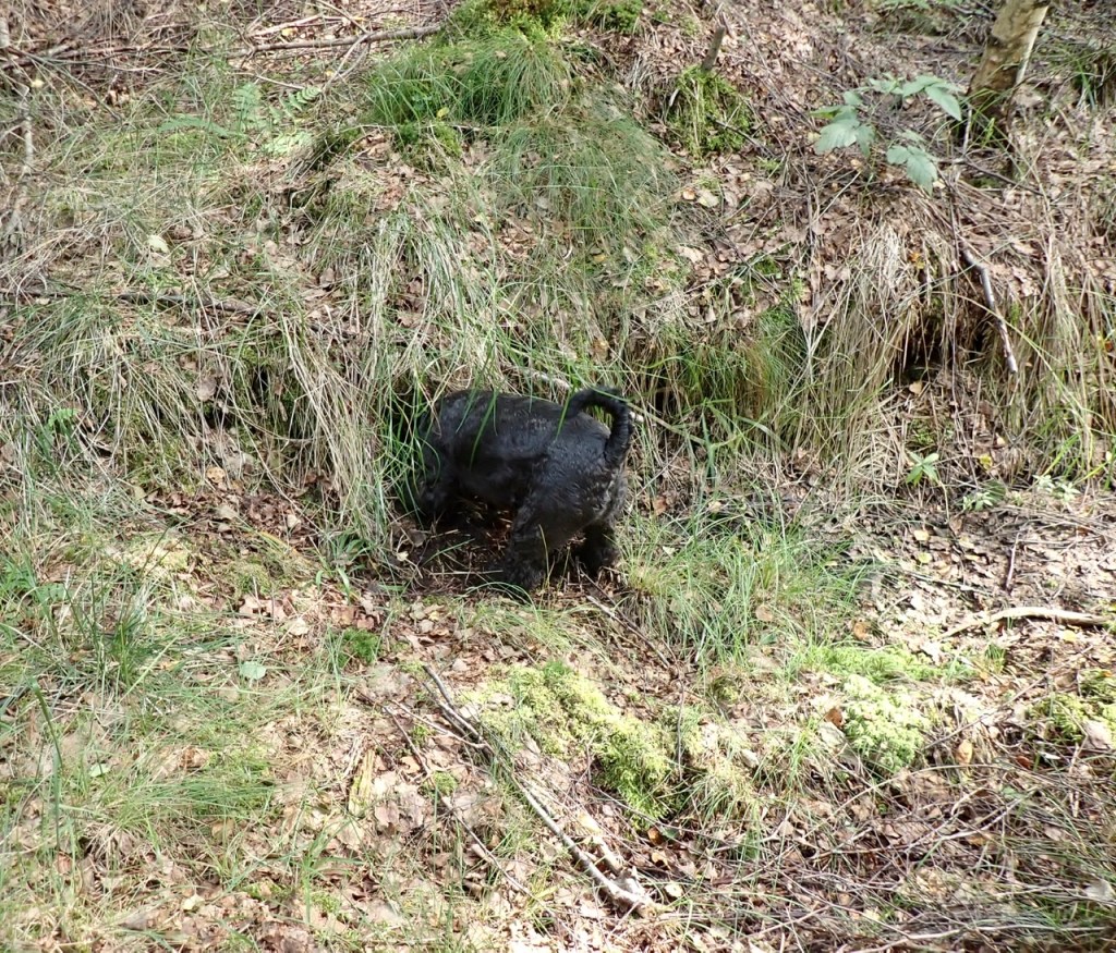 Råtthål hippie ett råtthål! Det måste kollas upp noga om det är någon hemma. Troy stoppar in hela huvudet i hålet och skäller lite. Om det är någon råtta där nere gräver vi med gemensamma krafter.