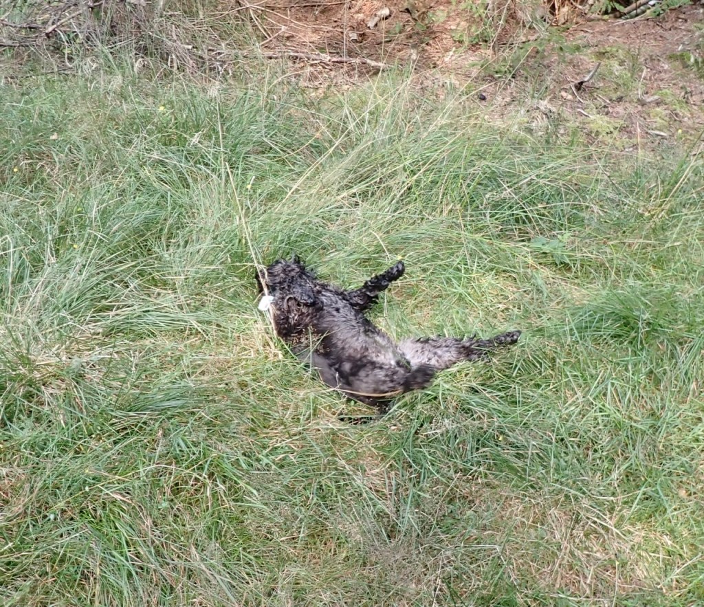 Så var det dags för Troys vanliga ryggrull. Han har hittat en perfekt plats, lite i skuggan med mjukt fuktigt gräs! Nosen gnuggas ordentligt i gräset till mattes förnöjsamhet.