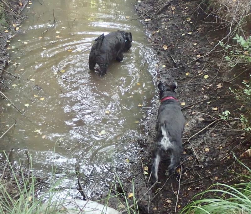 En inte helt torrlagd bäck fick besök av törstiga hundar. Troy måste naturligtvis i och plaska!