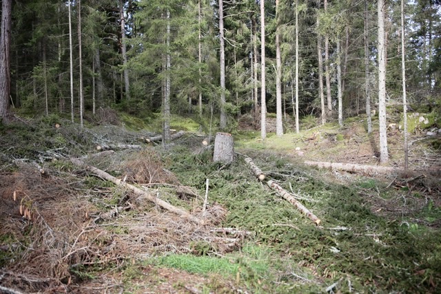 De har fällt många granar pga att granbarkborren har gjort stora angrepp på träden.