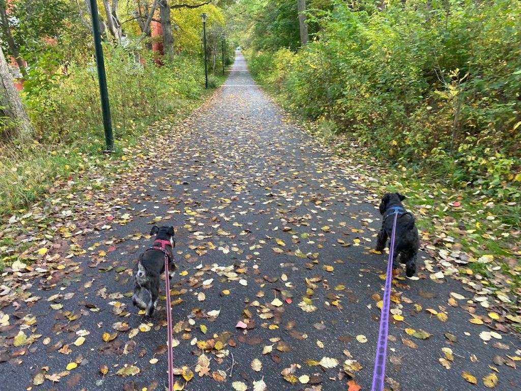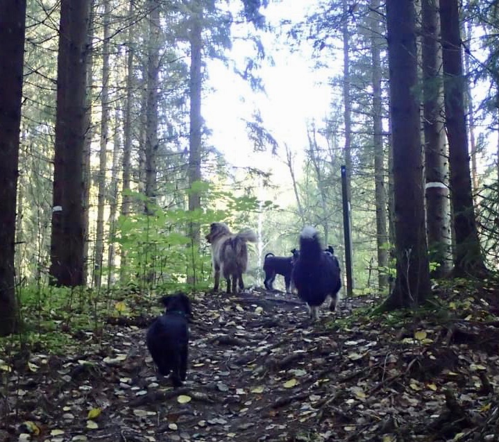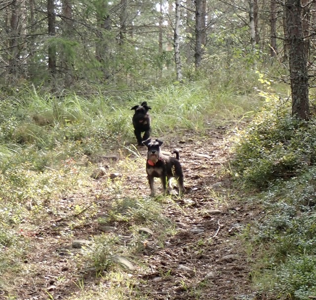 På eftermiddagen skulle vi ta en liten korttur i skogen men matte virrade runt och hittade lite taggsvamp. Det blev en lite längre promenad än tänkt så där en cirka 7 km för M men längre för oss eftersom vi kutar runt lite. M har en visselpipa som hon använder när hon tycker att vi skall komma till henne. Tror jag skall skaffa en sådan som är inställd på mattar.