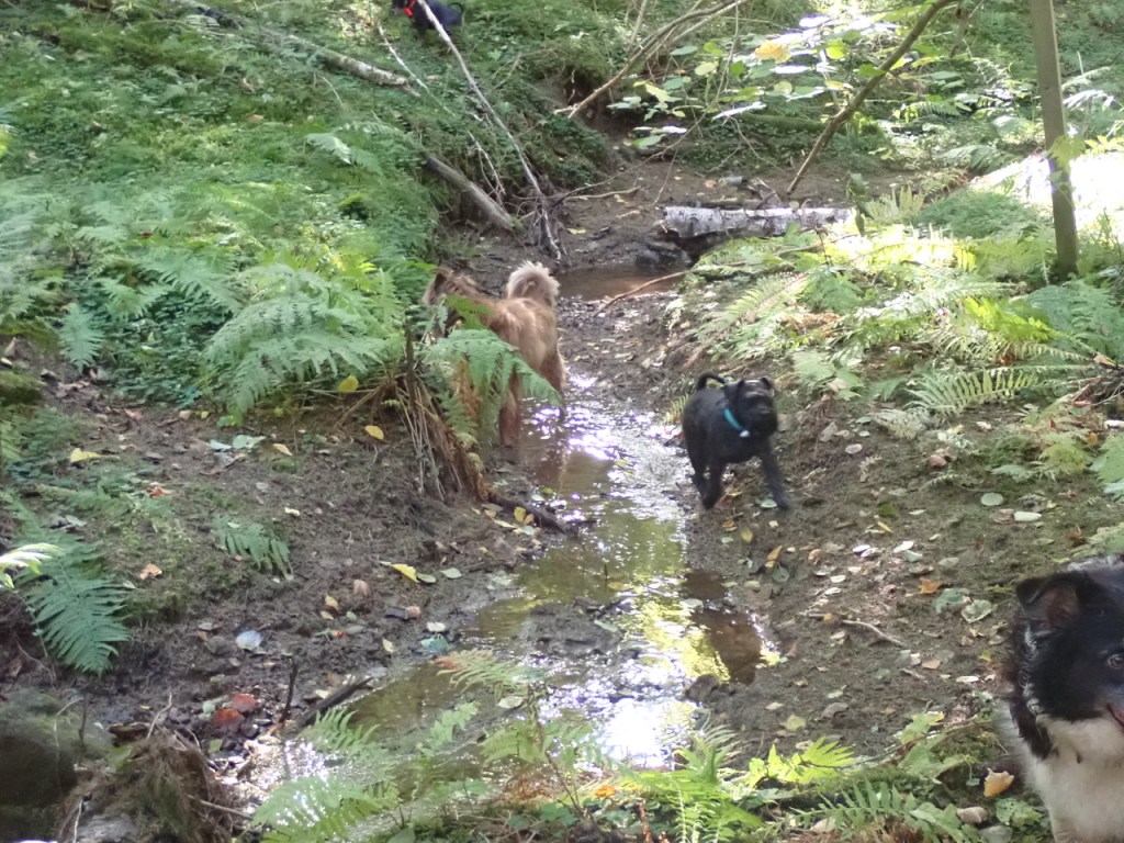 Vi fortsatte och gick ned till botten på ravinen och där rinner det lite vatten i en bäck. När Troy var upp på en sten som fanns mitt i bäcken försökte M varna honom för att det kan vara en djup hölja på andra sidan om stenen, men tror ni han lyssnade på henne då? Nähä plums i och där försvann han under ytan för att strax där på komma upp med ett ljudligt frustande. Han hoppade upp ur bäcken med en väldig fart och rusade runt som en tok för att försöka lufttorka. M muttrade lite om att ha en nybadad hund som inte var särskilt nybadad längre.