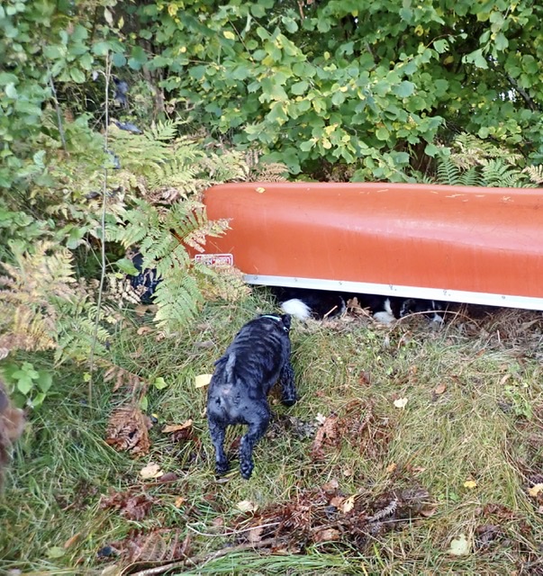 Wilma kröp in under en upp och nedvänd kanot. Det bonkade och lät när hon höll på men något där under. Hon hade grävt sig en grop och lade sig i sin egenfixade koja. Troy var fram och snackade med henne men hon ville stanna en stund där. Troy återvände till sjön för han skulle bada lite till.