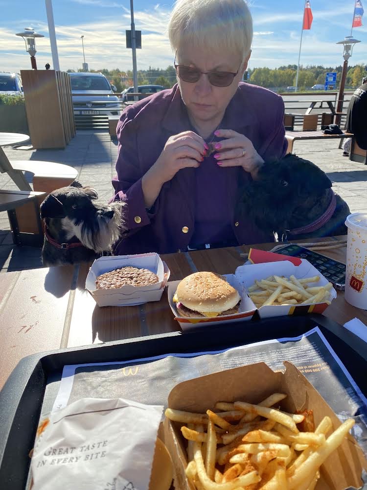 På vägen till Malmköping stannar vi till vid McDonalds då vi plötsligt har drabbats av akut hunger. Ja fast Troy är ju alltid hungrig. Matte handlar åt oss alla och vi får en QP att dela på en utan såna där äckliga tillbehör. Vi får sitta bredvid matte och vi sköter oss för det är hårda regler vid bordet, ingen självservering, inga nosar eller tassar på bordet. M delar rättvist ut små bitar till oss av vår QP, lite för rättvist tycker jag nog.
