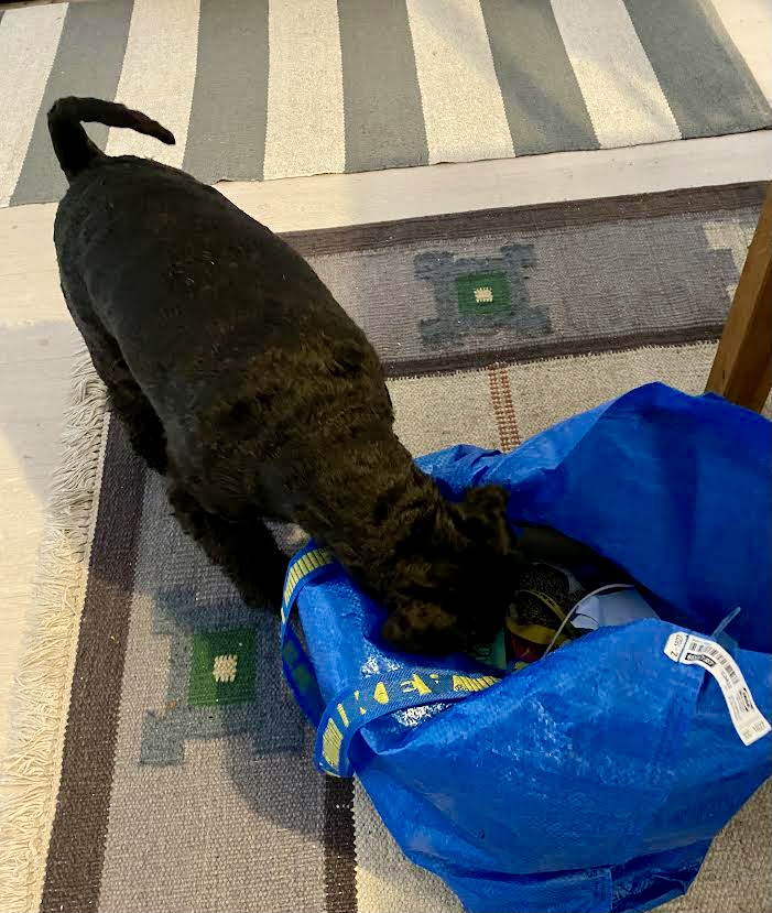 Söndag bloggen publicerad och här pågår något. H&M plockar ner lite saker i en väska, skall vi åka till vagnen? JA det ska vi! Troy kollar att allt som ska med är packat. Bollar godis och inte att förglömma osttuben.