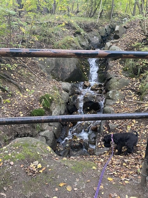 De har släppt på vatten från vattenreservoaren och Troy ville naturligtvis ned i fåran men det sa matte nej till. Det är superhalt på stenarna du får nöja dig med att titta.