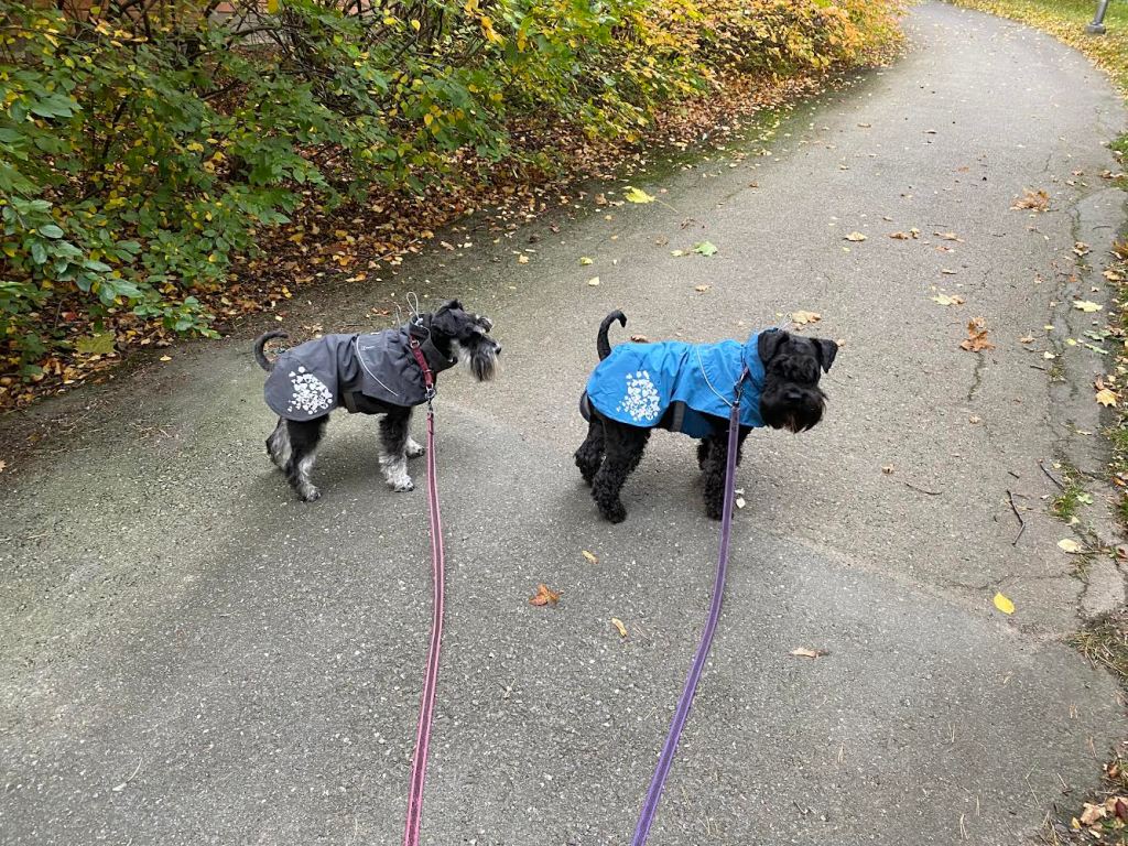 Vad är det frågan om!? Husse lurade oss det regnar inte alls och matte var för snabb på att plocka fram de förhatliga regnjackorna! En hel långpromenad i dem och inget regn. Alltså detta tilltag kommer kosta godis, mycket godis när vi kommer hem. Jag säger som som tysken skulle sagt, es kostet.