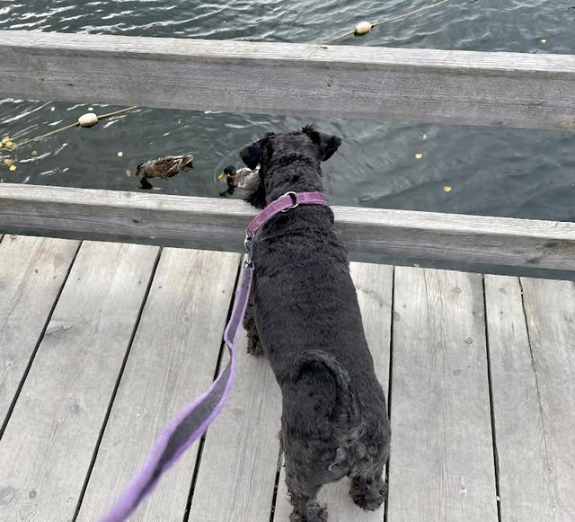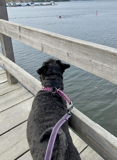 Här står en djupt avundsjuk Troy som inte fick hoppa vi och simma ihop med tjejen. Matte säger att det är för kallt i vattnet.