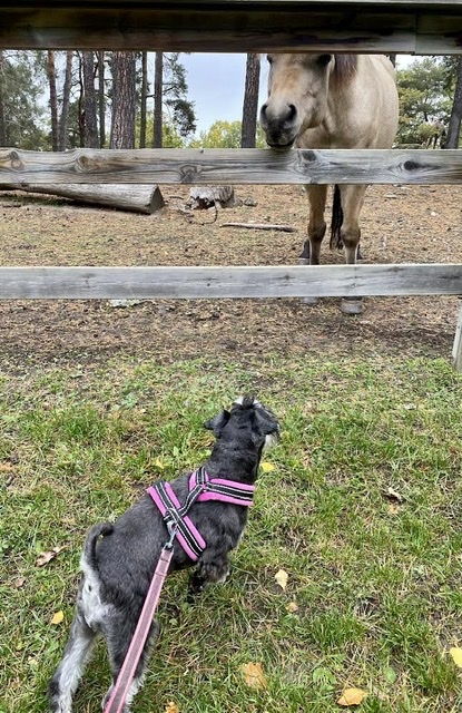 Troy var modigare han, han gick nästan fram till staketet och fick en lååång hals för att noshälsa. Då frustade den där stora saken till. Gissa om Troy blixtsnabbt kan hoppa långt baklänges och allt i ett enda skutt. Sen började han tokskälla på hästen men då sa matte ifrån att det fick han inte göra.