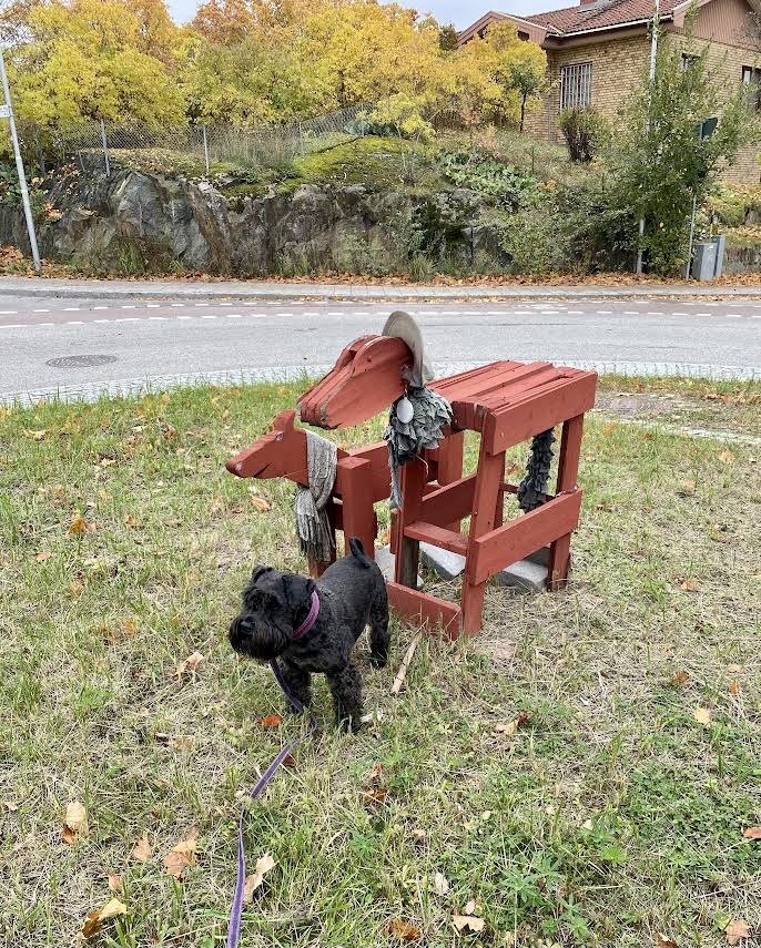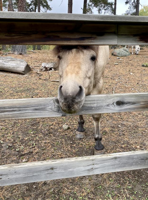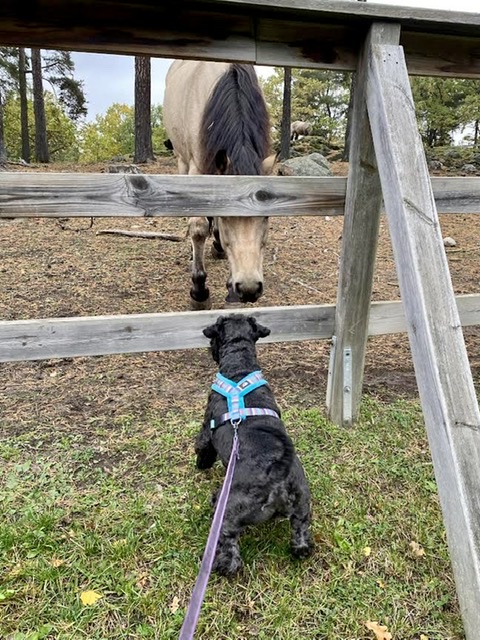 Hon påstår att den hästen är väldigt snäll och att hästar hälsar så. Sen går vår tokiga matte fram till den där farliga besten. Kliar den lite mellan ögonen och ger den lite gräs hon plockat på backen utanför staketet. Den mumsar i sig allt medans vi håller oss på behörigt avstånd.