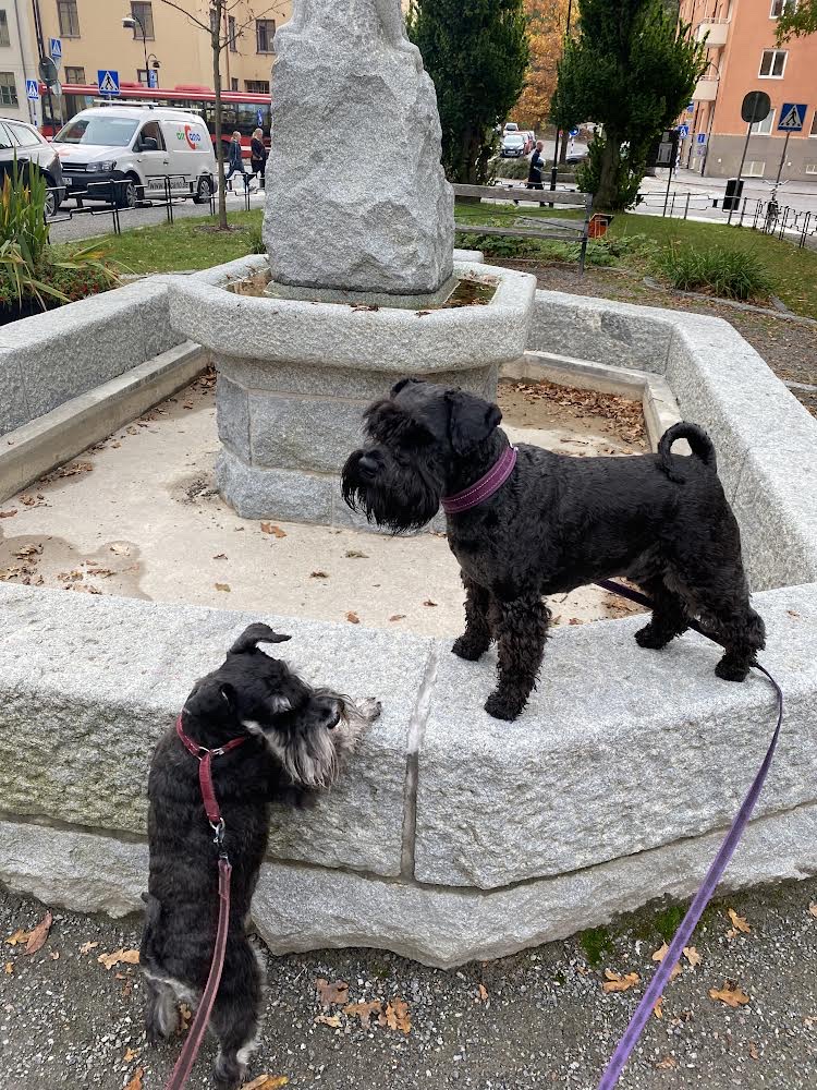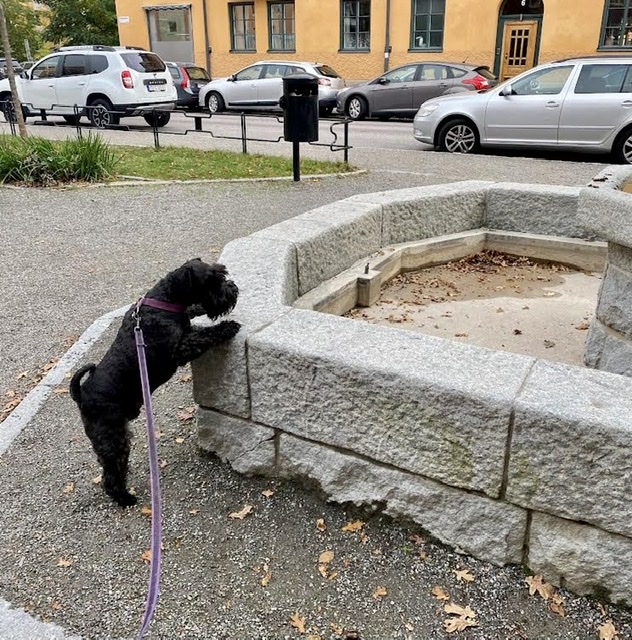 Jag måste ju kolla jag också. Ja det stämmer inget vatten för honom att plaska runt i. Nu dröjer det flera månader, ja faktiskt en hel vinter innan de fyller upp fontänen igen. Troy var väldigt besviken!