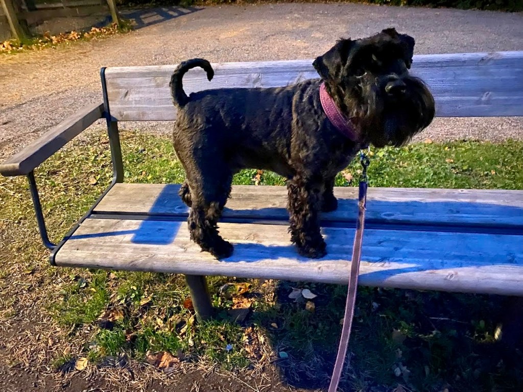 Om man på promenaden inte hittar några godisstenar att hoppa upp på kan väl en bänk få duga. Nog är den värd lite godis iallafall?